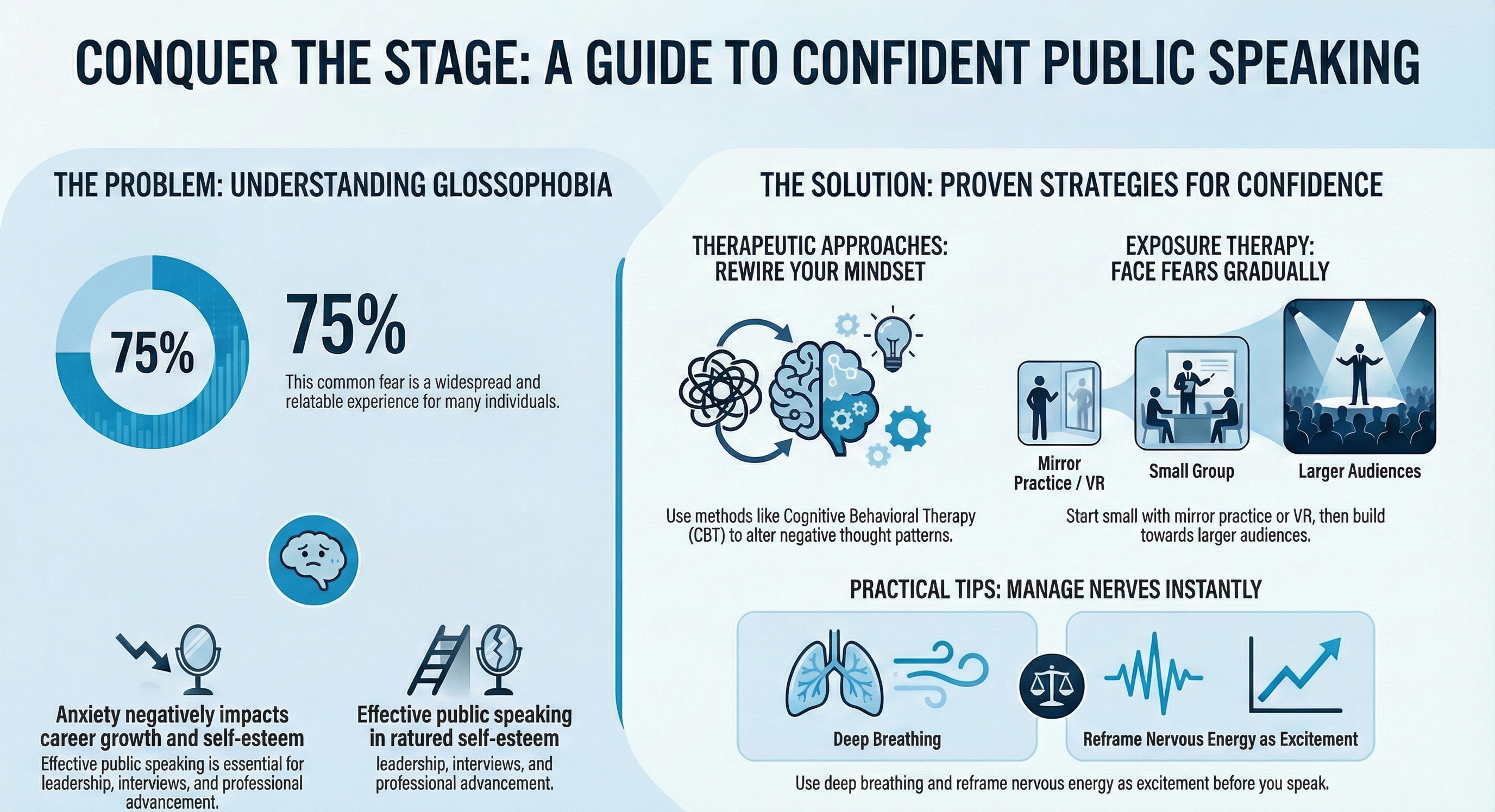 By integrating these therapeutic approaches, exposure techniques, and practical tips, individuals can effectively overcome public speaking anxiety. The journey from fear to confidence is achievable with the right tools and mindset, empowering individuals to communicate with ease and assurance in any setting.