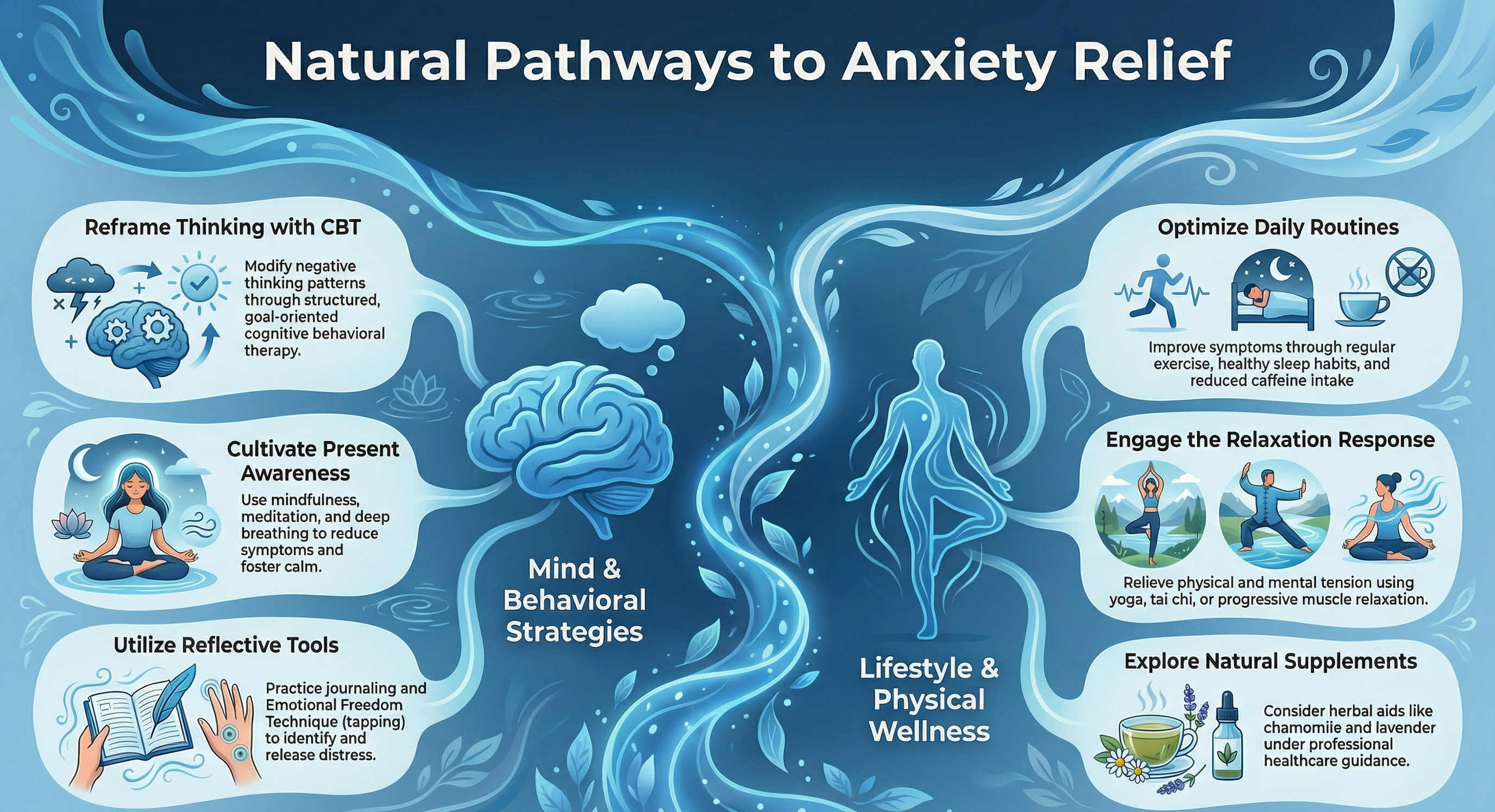 By exploring these natural strategies, individuals can find effective ways to manage anxiety without relying on medication. Each method offers unique benefits, contributing to a comprehensive approach to anxiety relief. Whether through behavioral therapy, mindfulness, relaxation techniques, lifestyle changes, or herbal supplements, there are numerous options available to support mental well-being naturally.