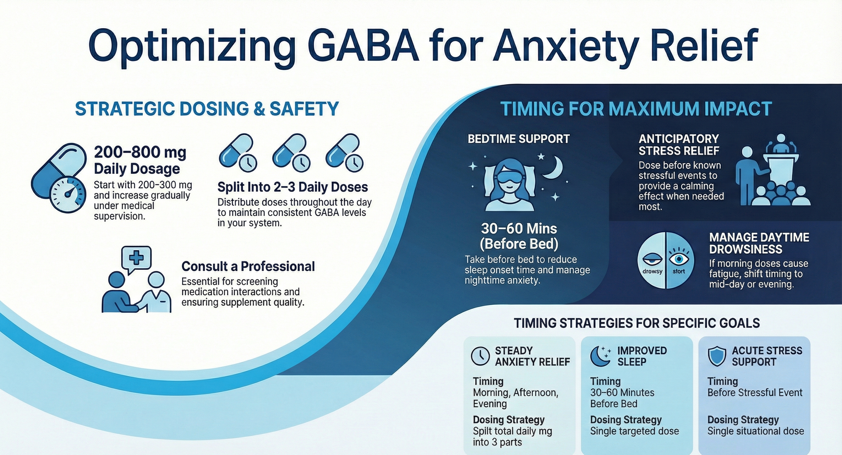 Understanding the optimal timing for taking GABA is key to maximizing its benefits for anxiety relief. By considering dosing strategies, individual needs, and the timing related to sleep and anxiety, you can make informed decisions about incorporating GABA into your routine. Remember to start with lower doses and consult with a healthcare professional to ensure safe and effective use.