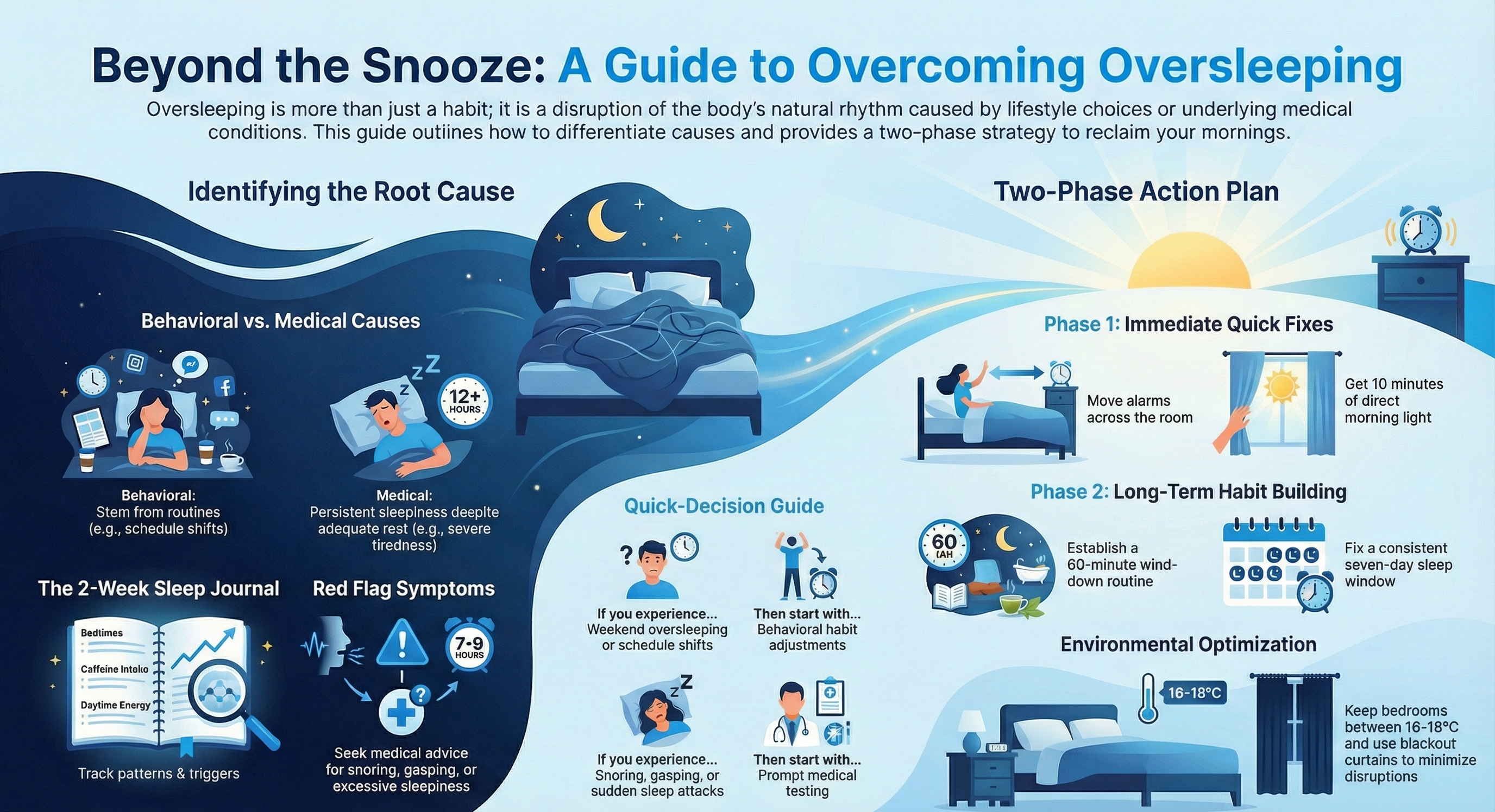 Common causes include irregular sleep schedules, late-night screen use, excessive naps, and undiagnosed sleep disorders. Keeping a sleep journal helps you see whether behavioral patterns or medical issues are driving oversleeping and guides how to stop oversleeping effectively.
