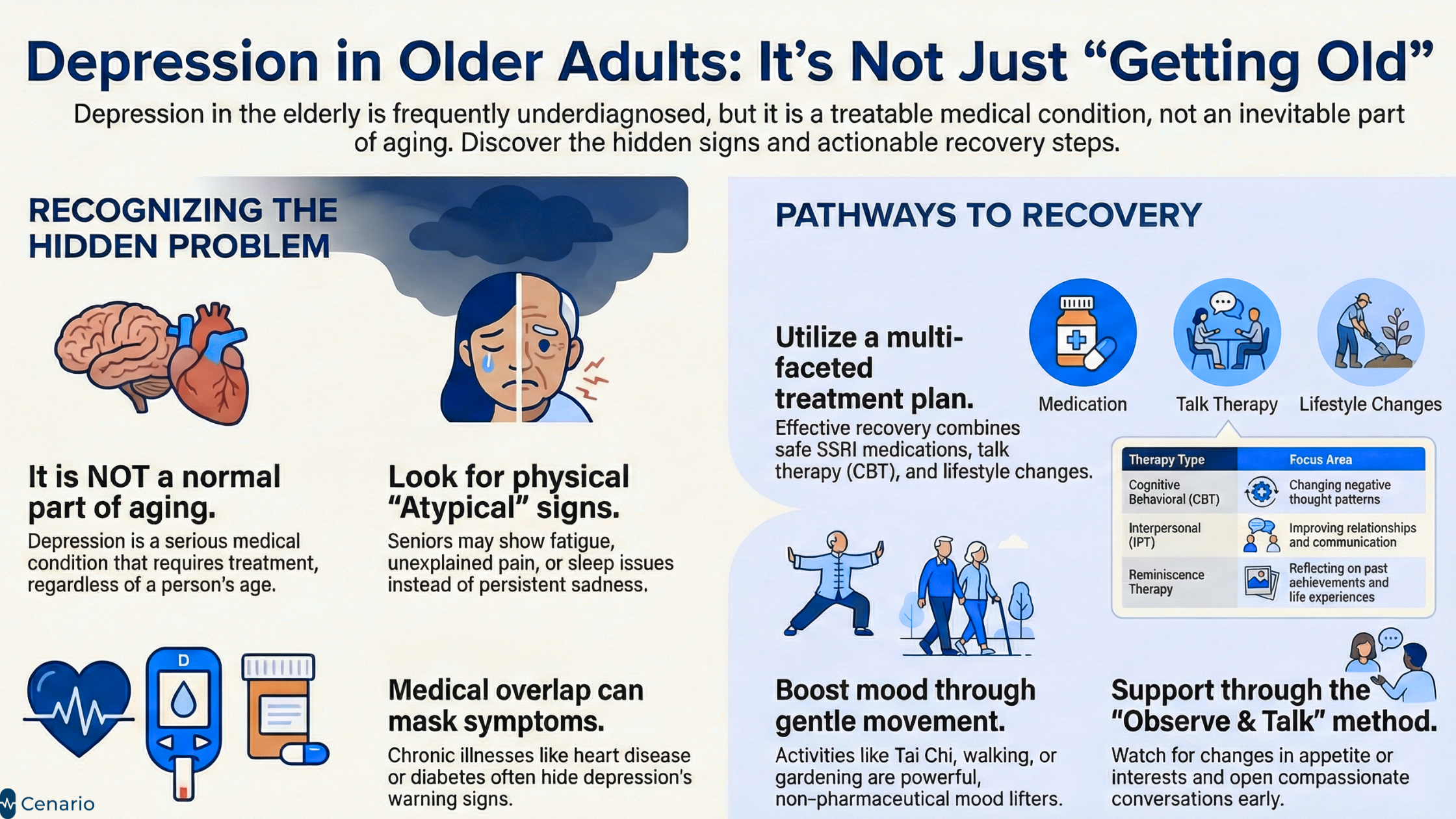 Depression in older adults is a serious mental health condition that affects the way someone thinks, feels, and lives day to day. It includes different types of mood disorders, from major depression to less severe but long-lasting types like dysthymia.