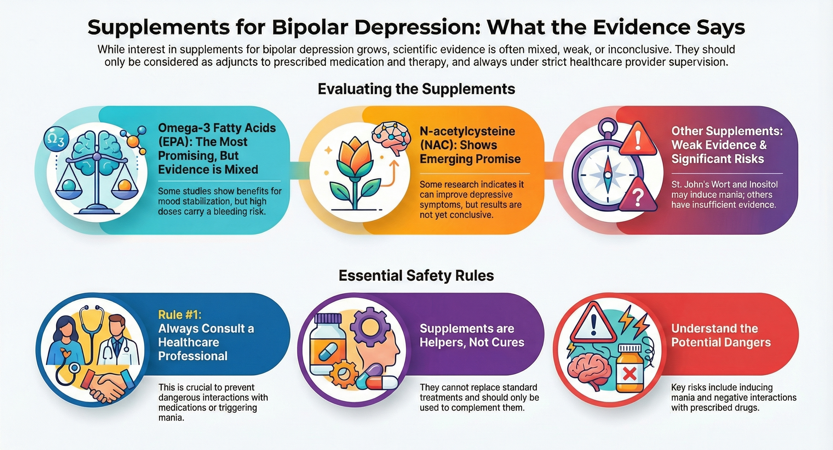 While some supplements have shown promise in supporting mental health, it is important to emphasize that they should not replace standard medications prescribed for bipolar depression. Instead, they may offer supplementary benefits that can complement conventional treatments. The key is to adopt an evidence-based approach, ensuring that any supplement use is backed by scientific research and professional consultation.