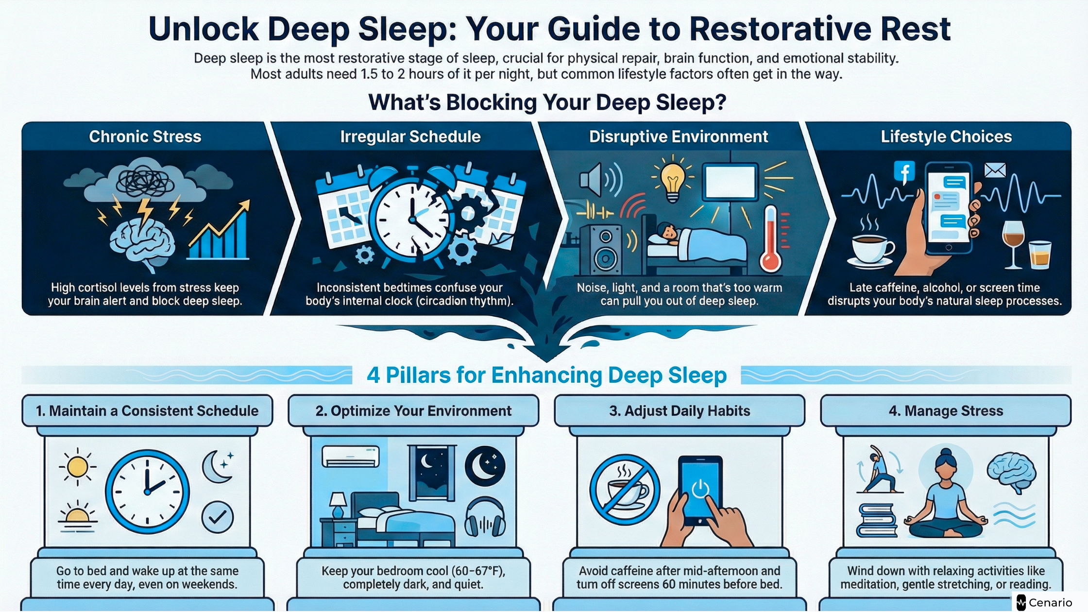 Poor deep sleep can result from stress, irregular sleep schedules, high cortisol levels, poor sleep habits, and an unsupportive sleep environment. Factors like caffeine, alcohol, screen time before bed, and inconsistent circadian rhythms can also prevent the body from entering slow-wave sleep.