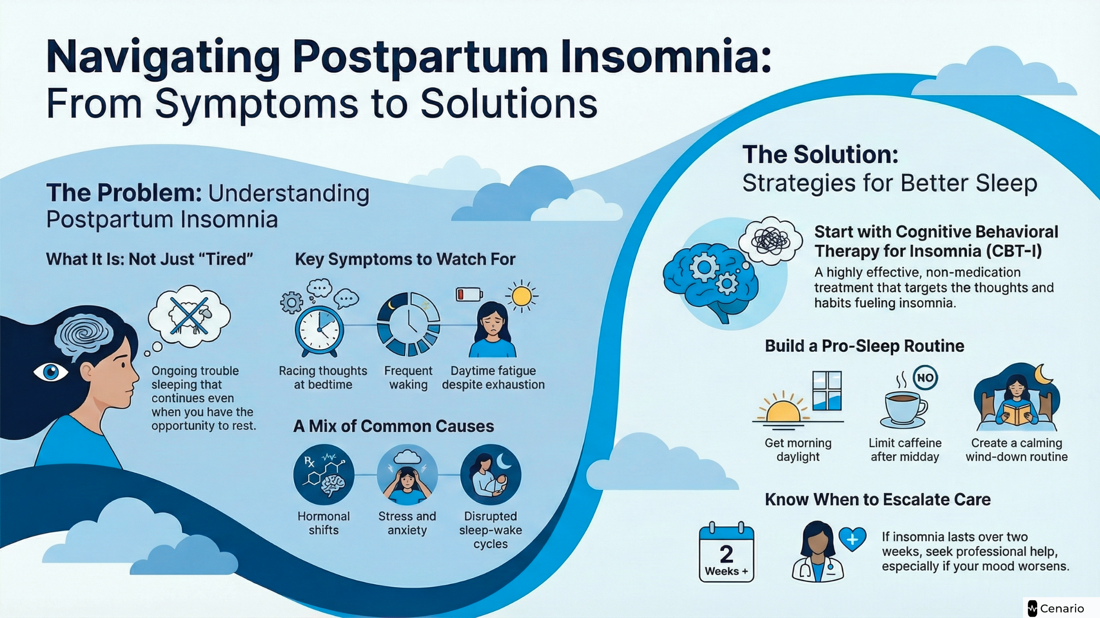 Postpartum insomnia is common, but it is not something you have to live with indefinitely. The goal is not perfect sleep, but predictable, restorative rest that supports mental health and daily functioning.