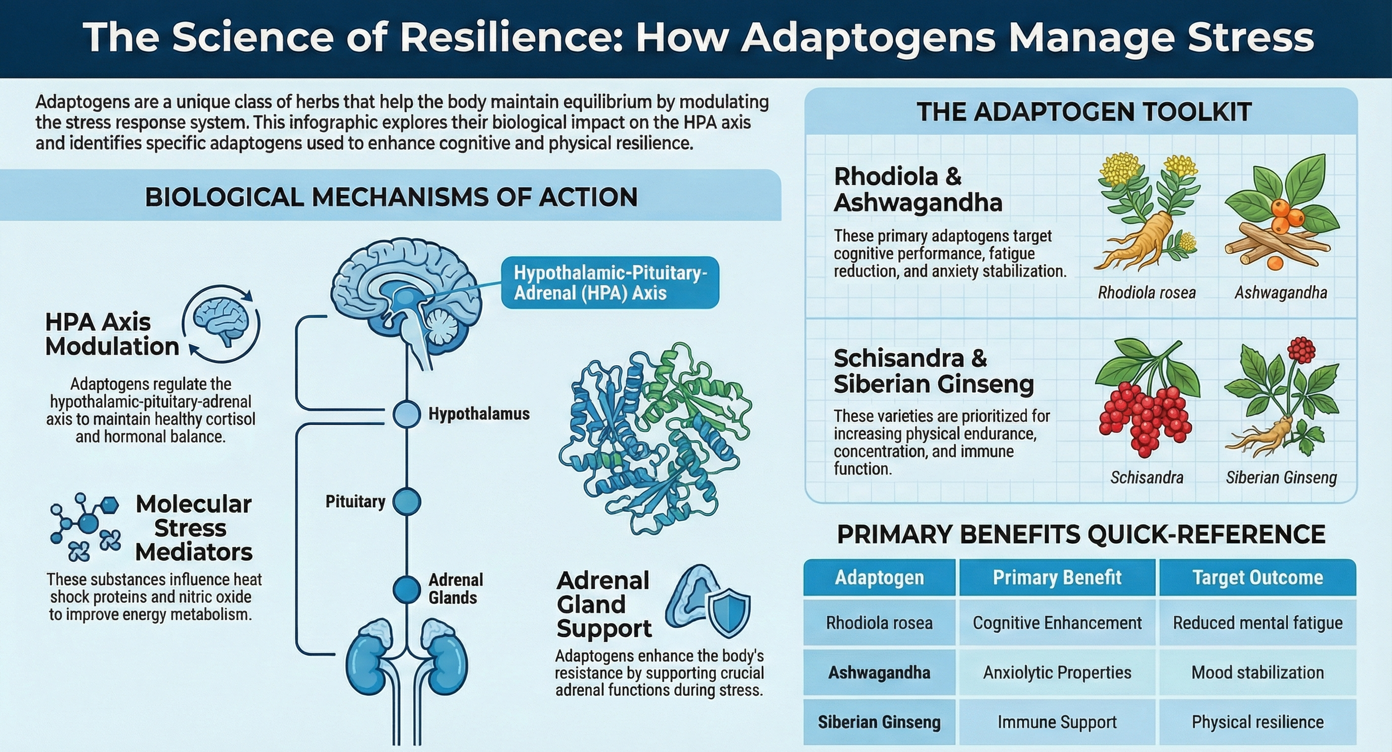 Adaptogens are believed to interact with the body’s stress response systems, particularly the hypothalamic-pituitary-adrenal (HPA) axis. This axis plays a critical role in how the body reacts to stress, influencing the release of cortisol, a hormone that helps manage stress levels. By modulating this process, adaptogens may help maintain hormonal balance and improve the body’s ability to cope with stress.