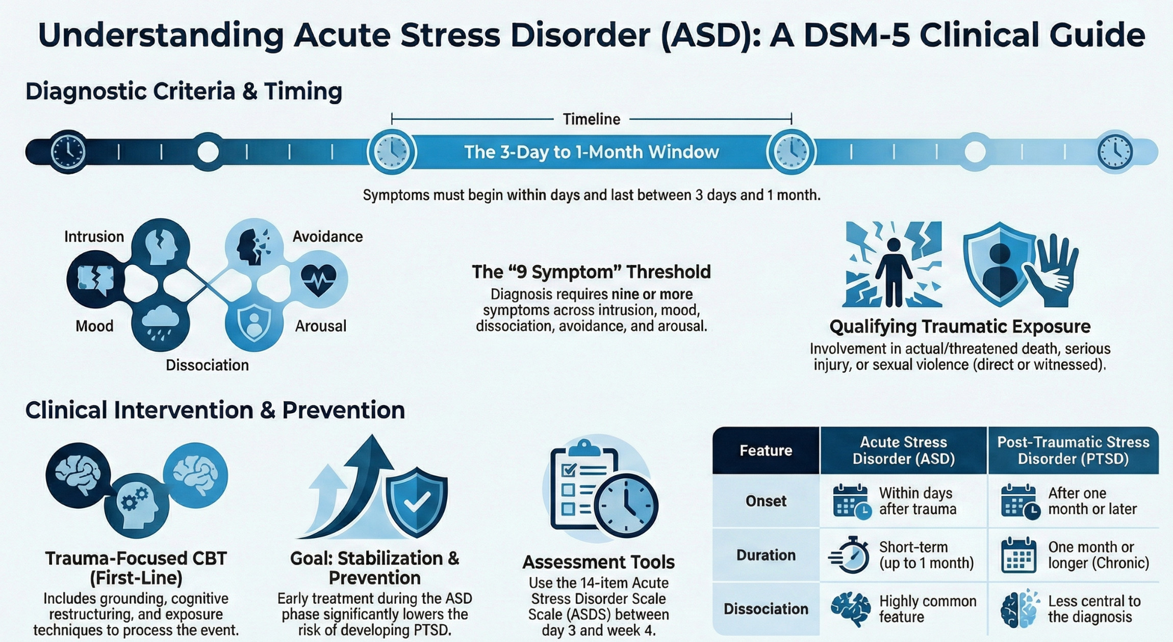 Acute stress disorder (ASD) represents a critical window for early intervention. When clinicians apply DSM-5 criteria, use structured assessment tools, and implement trauma-focused CBT, they can reduce distress, support stabilization, and lower the risk of long-term trauma complications such as post-traumatic stress disorder. Careful assessment, cultural sensitivity, and timely follow-up remain essential parts of effective trauma-informed care.