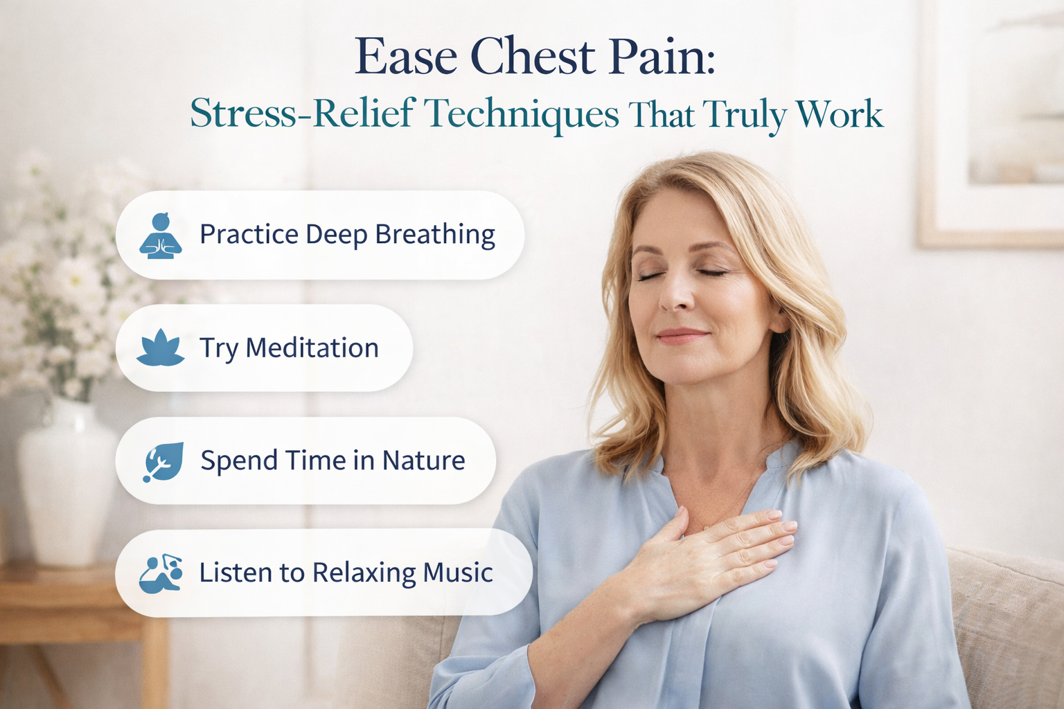 To quickly relieve chest pain from stress and anxiety, try deep breathing exercises, mindfulness, or guided relaxation techniques. These methods help calm the body’s stress response and reduce physical tension, providing immediate relief.
