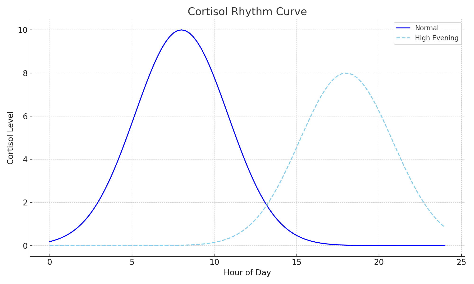 The hormone should peak within the first hour after waking and then fall gradually through the day. It should reach its lowest point at night so melatonin can take over. Any shift in this curve produces predictable outcomes.
