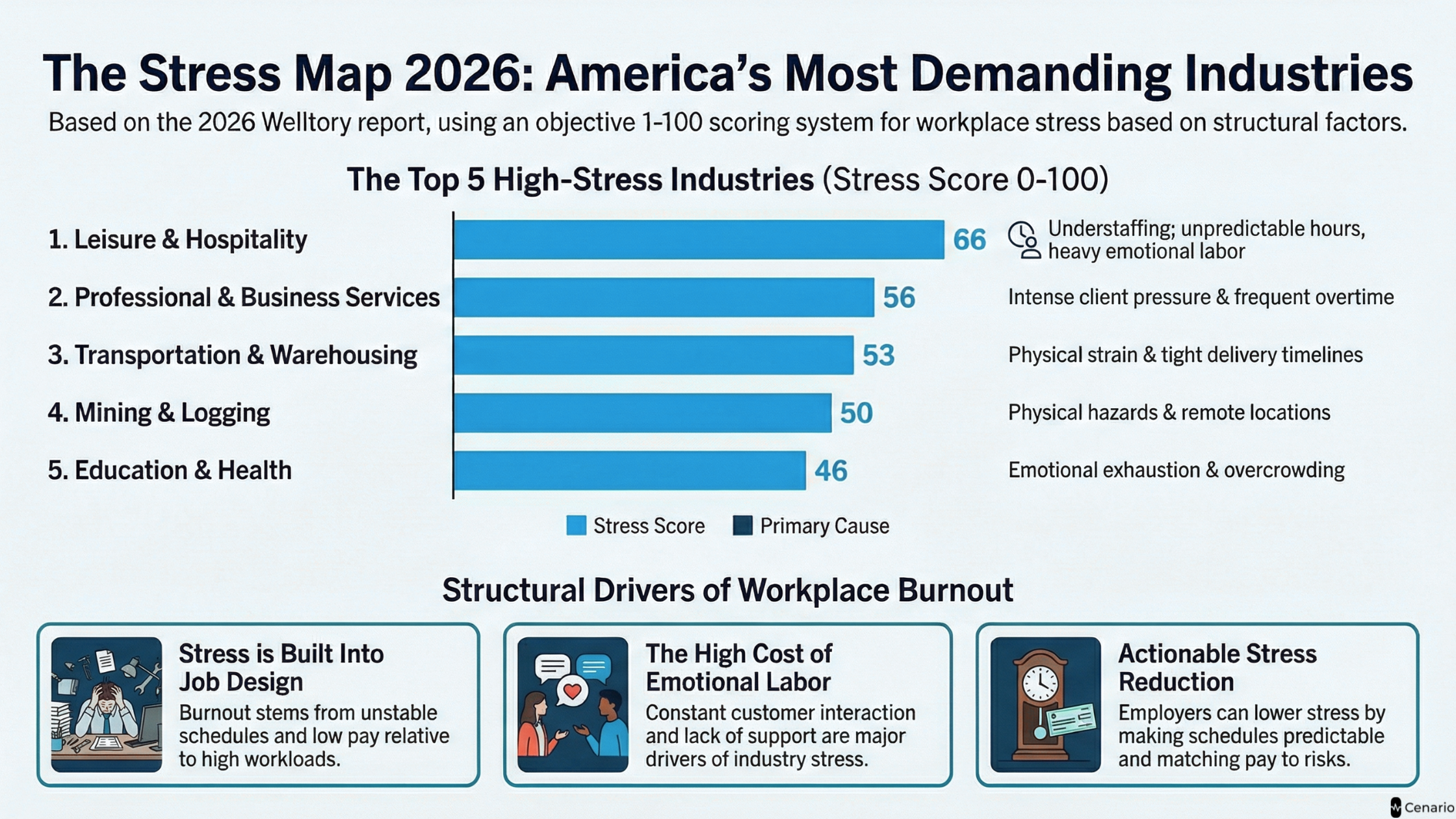 The results show that leisure and hospitality is the most stressful industry, mainly due to erratic schedules, emotional labor, low wages, and constant understaffing. Other high-stress sectors include: