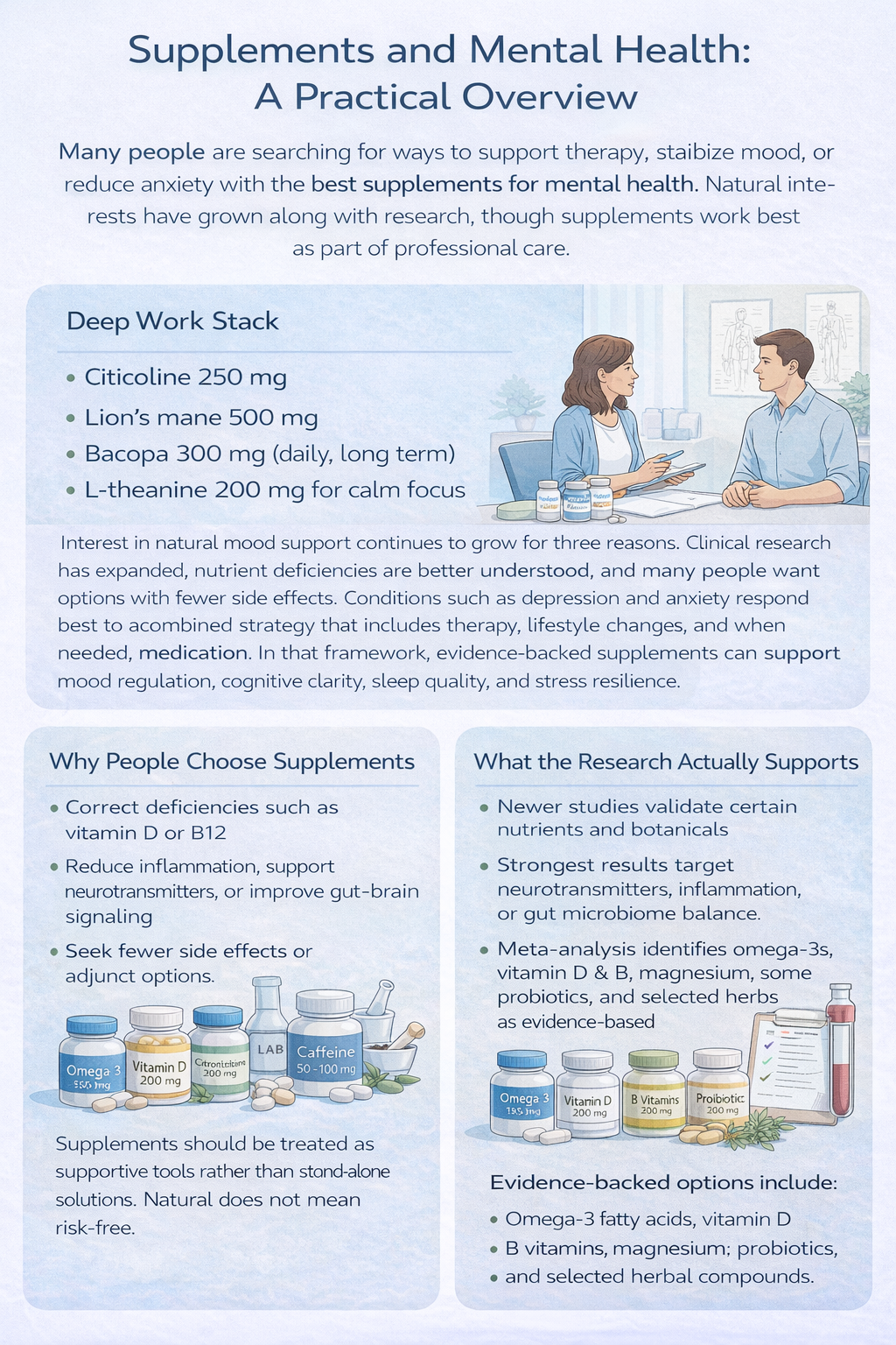 Some supplements can help when they target real biological gaps such as nutrient deficiencies, inflammation, or gut-brain signaling. They work best as support alongside therapy, lifestyle changes, and medical care. Supplements are not cures, but evidence-backed options can improve response to other treatments.