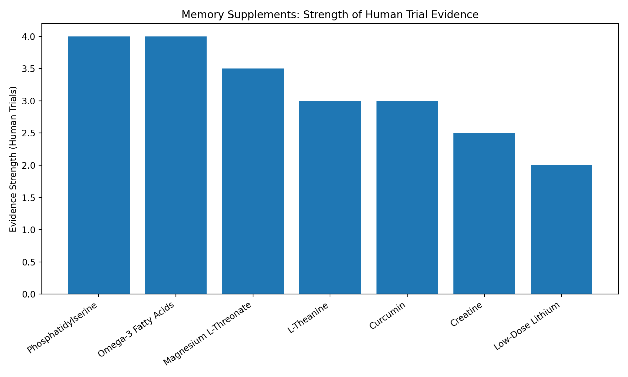 How it works: PS supports cell membrane structure and signaling in neurons, which may help age-related cognitive decline. Evidence strength: multiple randomized trials in older adults show small to moderate benefits for attention and recall.