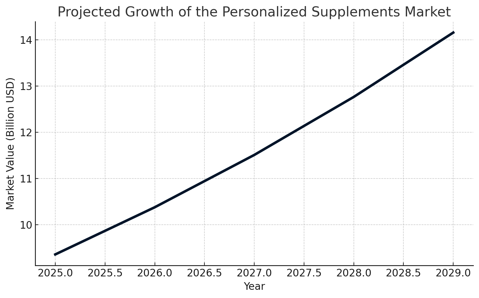 The personalized supplements market is experiencing remarkable growth, with projections indicating a substantial increase in value. By 2025, the global market is expected to be valued at $9.36 billion, with a projected increase to $14.17 billion by 2029. This growth, at a compound annual growth rate (CAGR) of 10.9%, underscores the increasing consumer interest in tailored nutrition solutions.