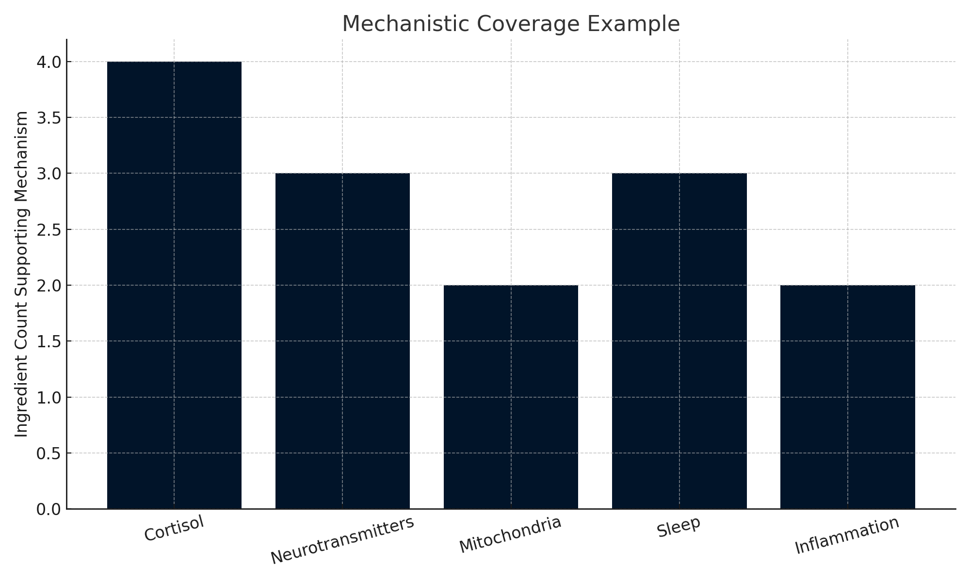 The height of each bar represents how many ingredients support a specific biological mechanism in a balanced formula.