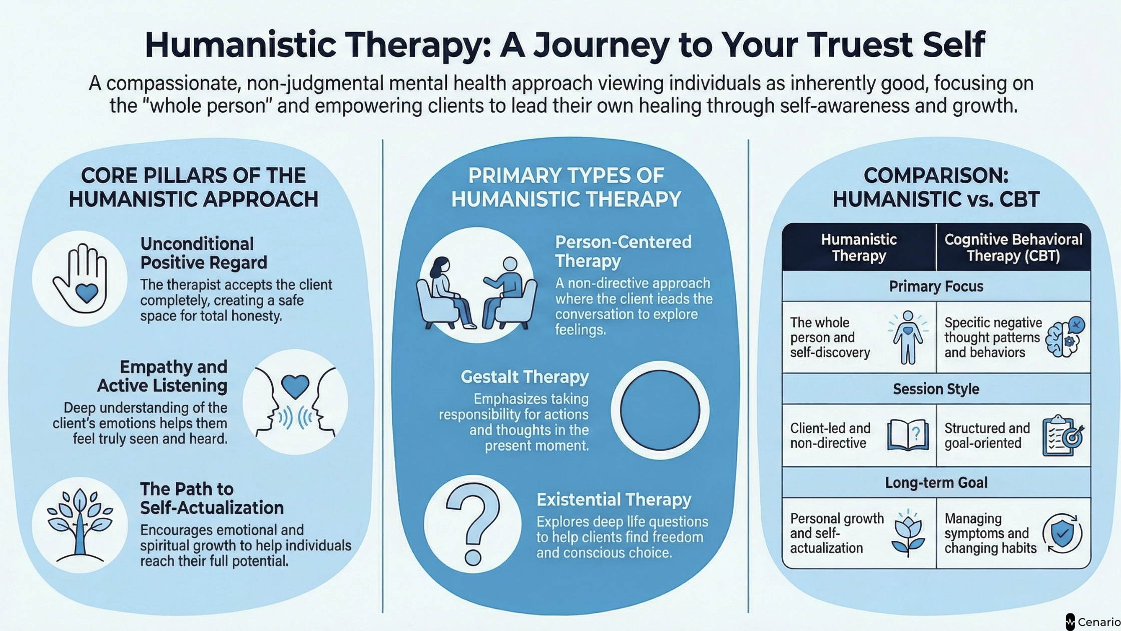 Humanistic therapy is a type of humanistic therapy that puts the person, not their problem, at the center of the healing process. It is based on humanistic psychology, a perspective that believes people are naturally good, have free will, and strive toward becoming the best version of themselves.